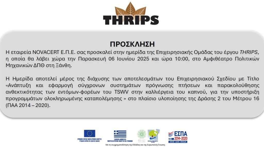 Η εταιρεία NOVACERT Ε.Π.Ε. σας προσκαλεί στην ημερίδα της Επιχειρησιακής Ομάδας του έργου THRIPS, η οποία θα λάβει χώρα την