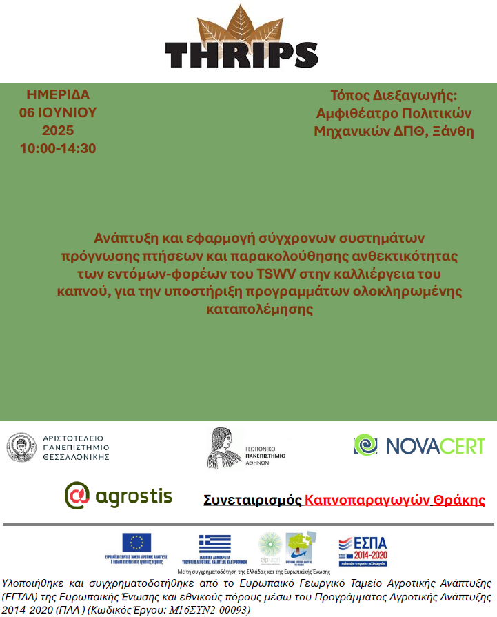 Η Ημερίδα αποτελεί μέρος της διάχυσης των αποτελεσμάτων του Επιχειρησιακού Σχεδίου με Τίτλο «Ανάπτυξη και εφαρμογή σύγχρονων συστημάτων πρόγνωσης πτήσεων και παρακολούθησης ανθεκτικότητας των εντόμων-φορέων του TSWV στην καλλιέργεια του καπνού, για την υποστήριξη προγραμμάτων ολοκληρωμένης καταπολέμησης » στο πλαίσιο υλοποίησης της Δράσης 2 του Μέτρου 16 (ΠΑΑ 2014 – 2020).